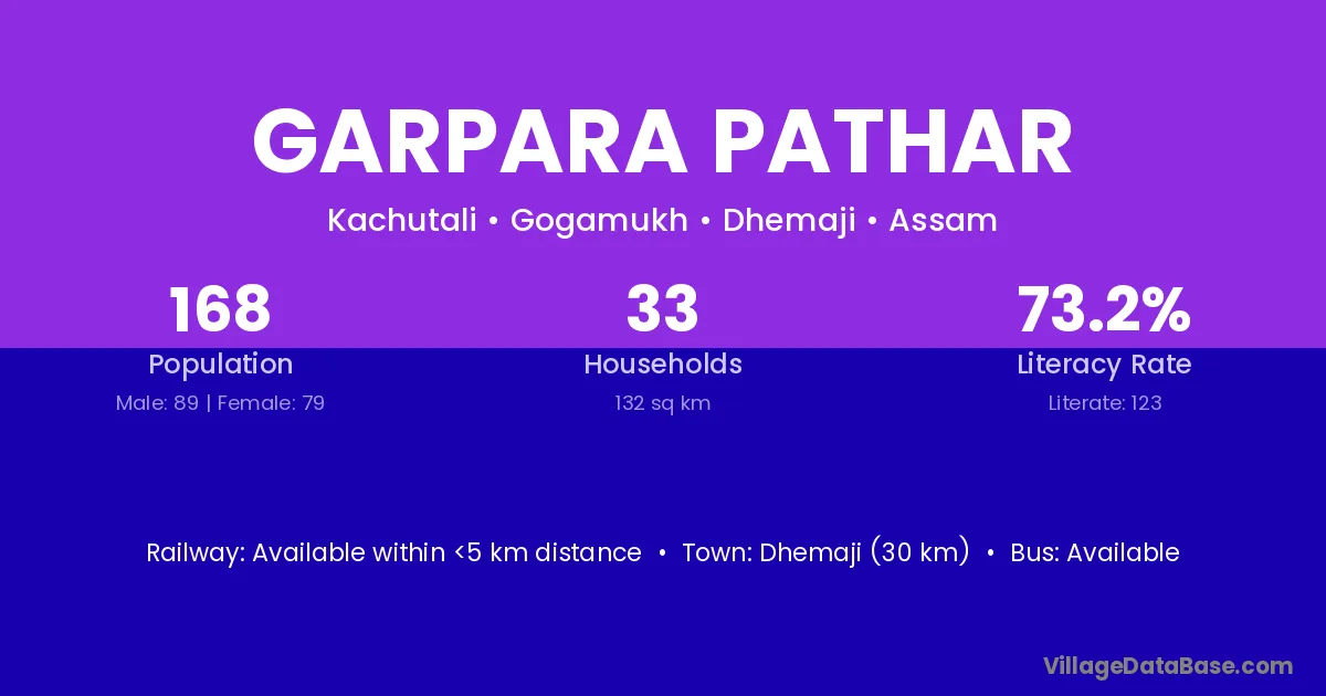 Dhemaji (30 km) is the nearest town to Garpara Pathar village for major economic activities and is located approximately 30 km away.