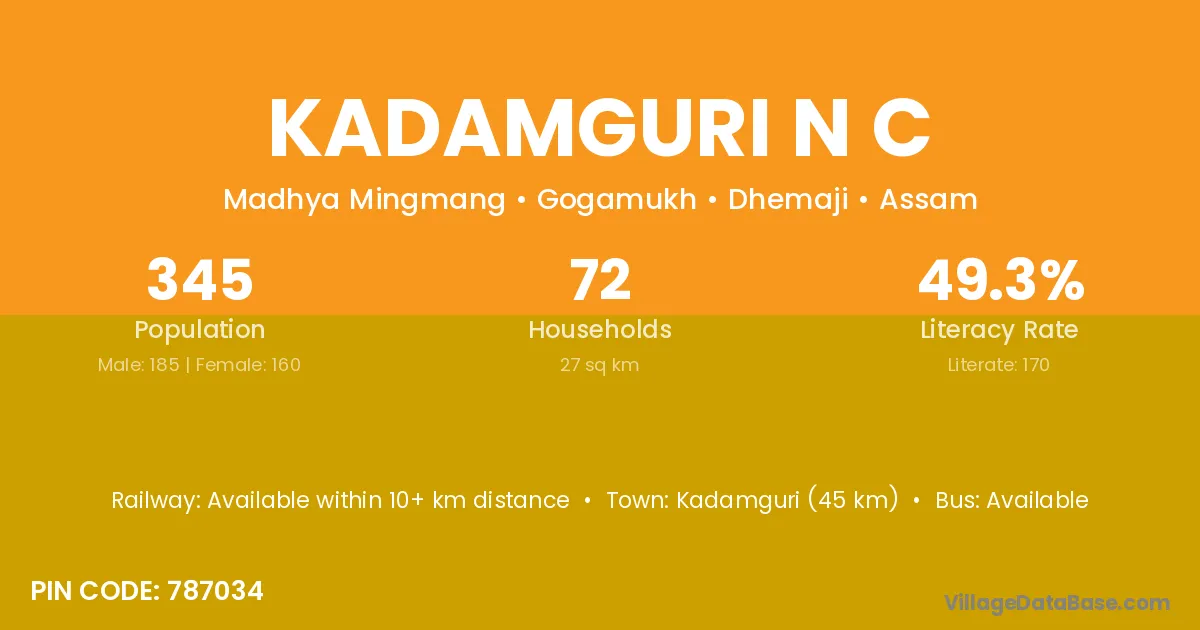 Kadamguri (45 km) is the nearest town to Kadamguri N C village for major economic activities and is located approximately 45 km away.