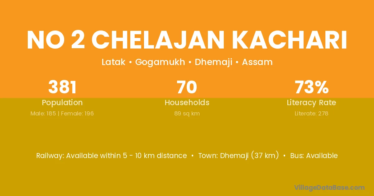 No 2 Chelajan Kachari village has a total population of 381 people, of which 185 are males and 196 are females.
