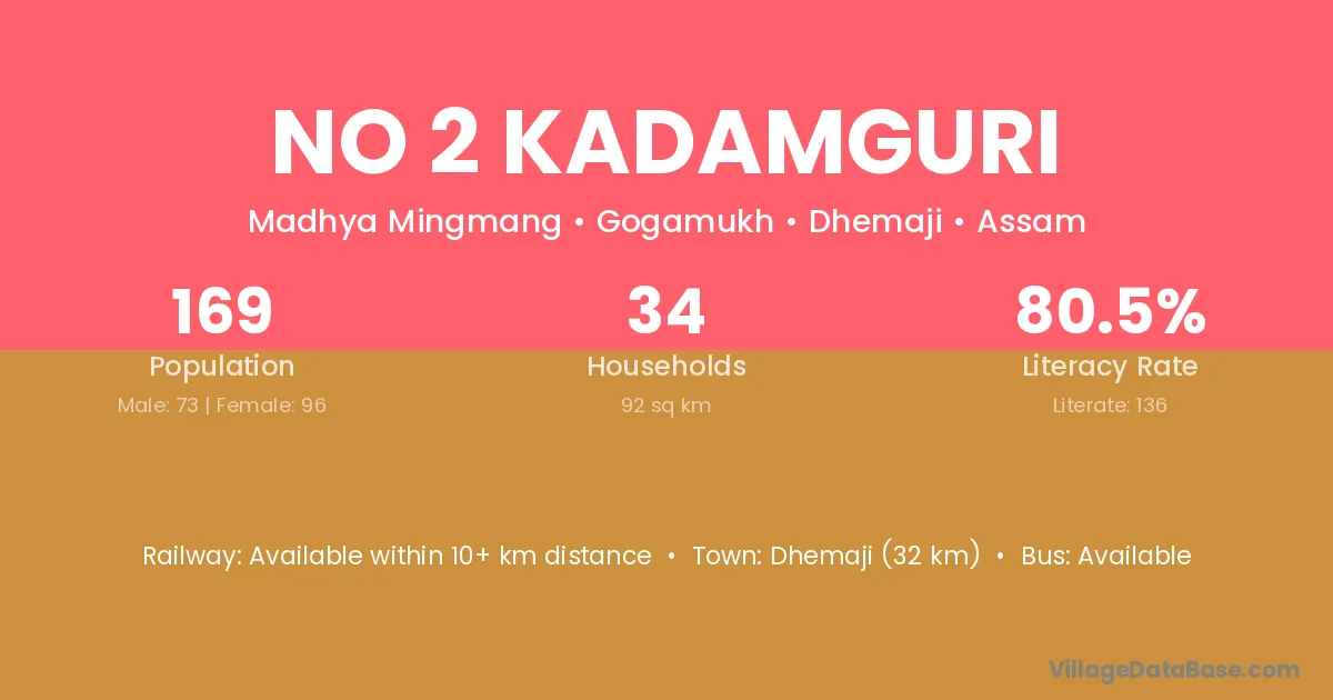 No 2 Kadamguri village has a total population of 169 people, of which 73 are males and 96 are females.