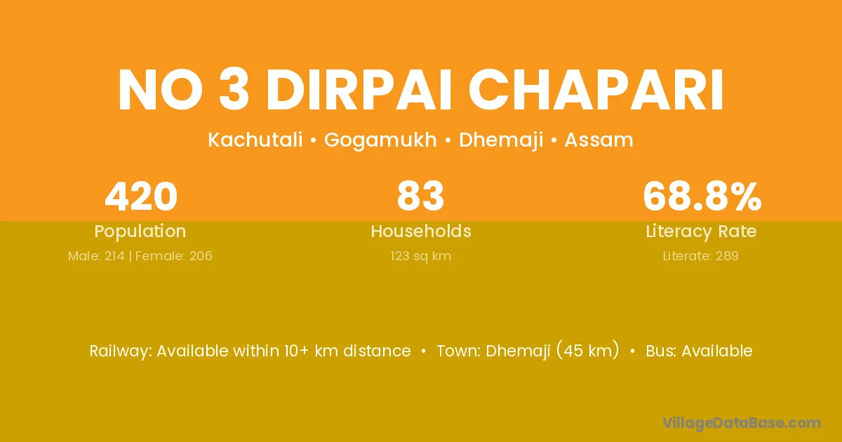No 3 Dirpai Chapari village has a total population of 420 people, of which 214 are males and 206 are females.