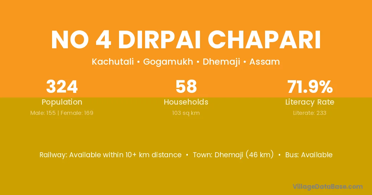 Dhemaji (46 km) is the nearest town to No 4 Dirpai Chapari village for major economic activities and is located approximately 46 km away.