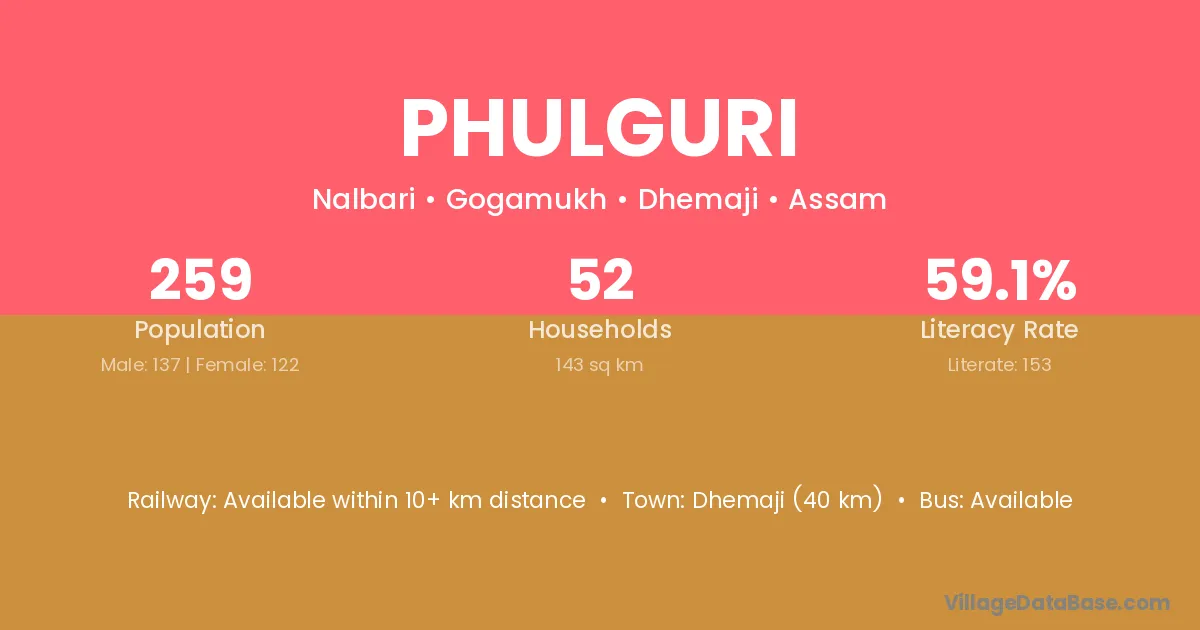 Dhemaji (40 km) is the nearest town to Phulguri village for major economic activities and is located approximately 40 km away.