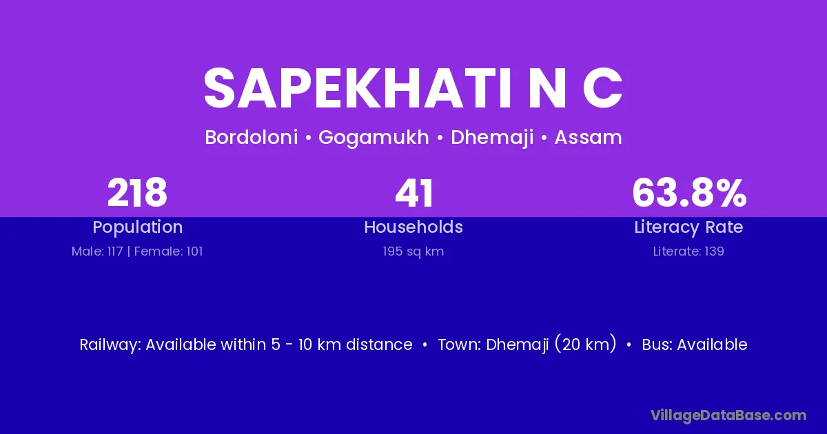 Dhemaji (20 km) is the nearest town to Sapekhati N C village for major economic activities and is located approximately 20 km away.