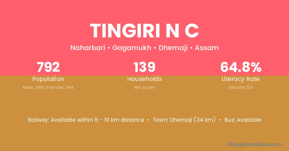 Tingiri N C village has a total population of 792 people, of which 398 are males and 394 are females.