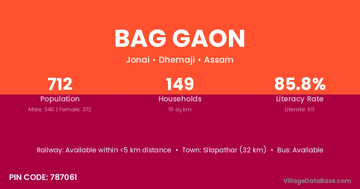 Silapathar (32 km) is the nearest town to Bag Gaon village for major economic activities and is located approximately 32 km away.