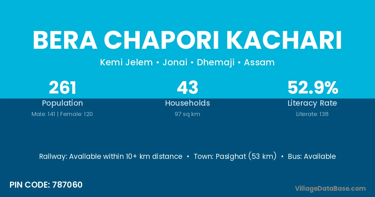 Pasighat (53 km) is the nearest town to Bera Chapori Kachari village for major economic activities and is located approximately 53 km away.