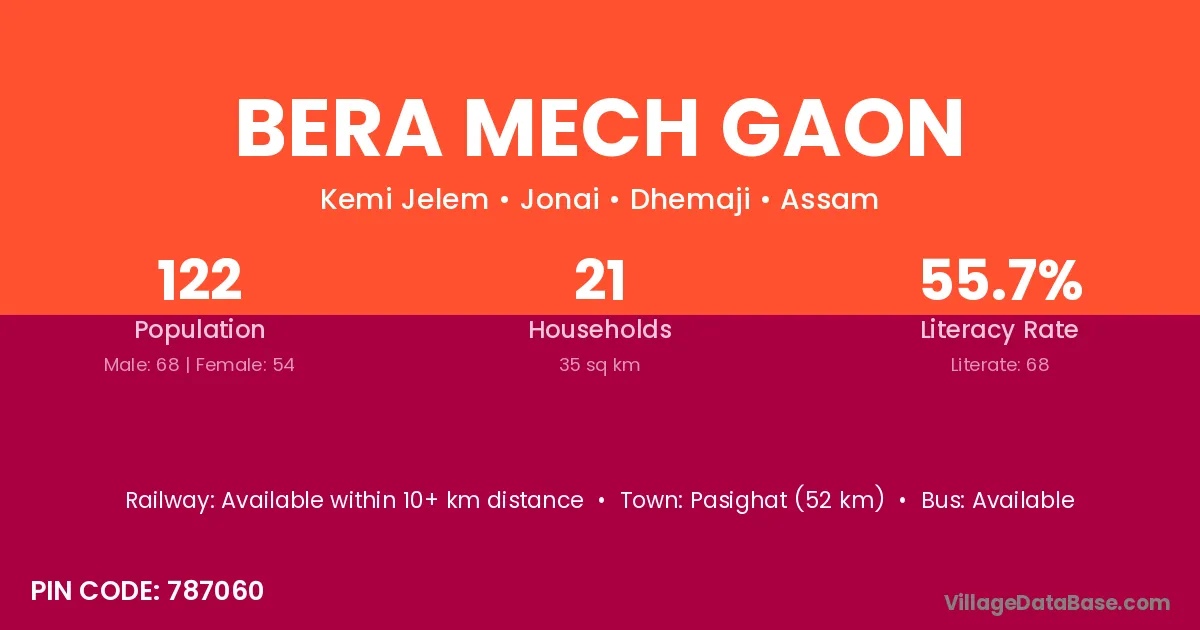 Bera Mech Gaon village has a total population of 122 people, of which 68 are males and 54 are females.