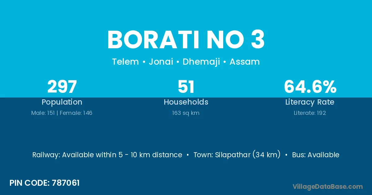 Silapathar (34 km) is the nearest town to Borati No 3 village for major economic activities and is located approximately 34 km away.