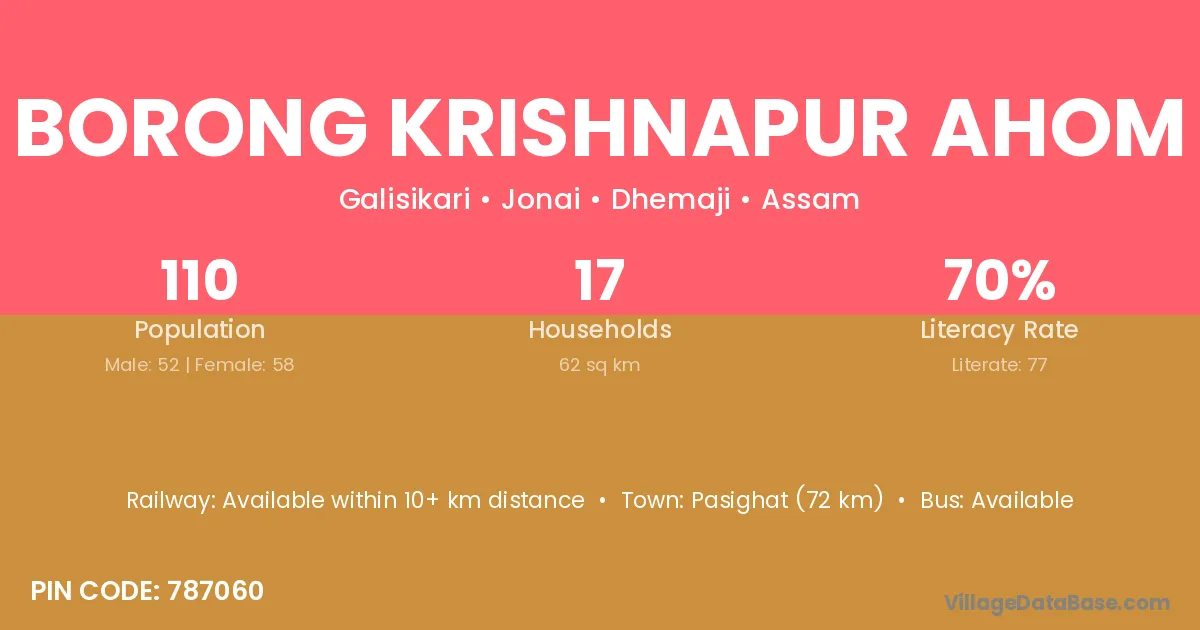 Borong Krishnapur Ahom village has a total population of 110 people, of which 52 are males and 58 are females.