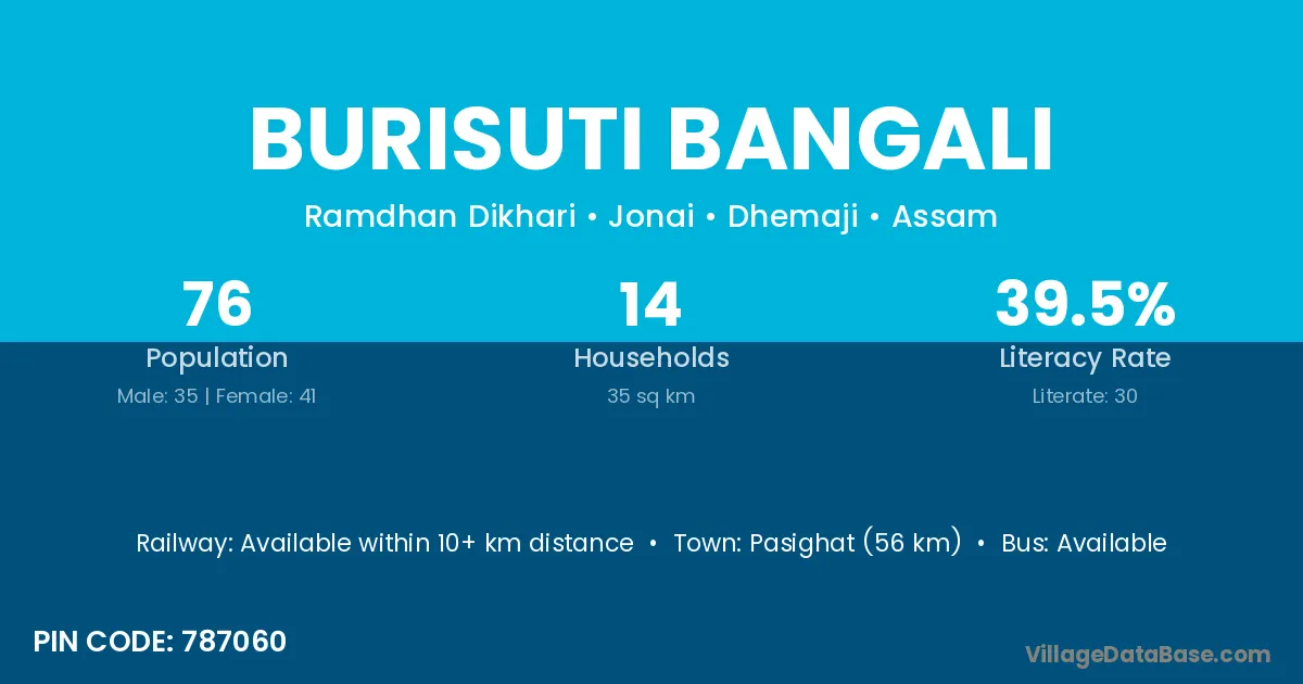 Pasighat (56 km) is the nearest town to Burisuti Bangali village for major economic activities and is located approximately 56 km away.