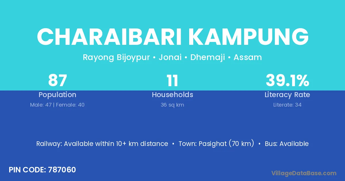 Pasighat (70 km) is the nearest town to Charaibari Kampung village for major economic activities and is located approximately 70 km away.