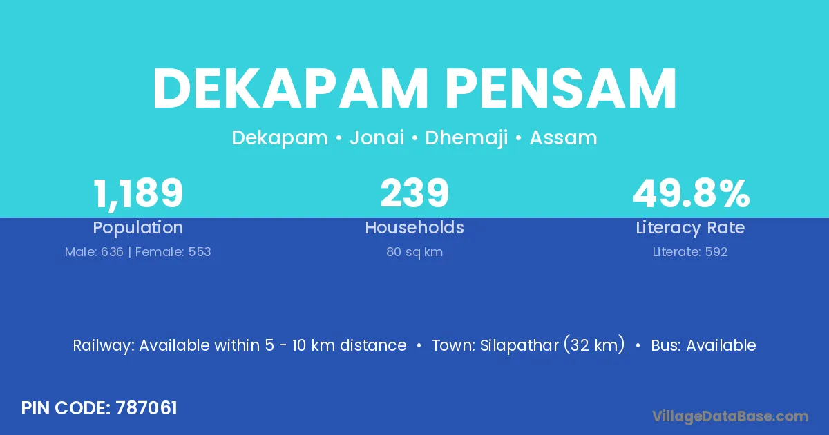 Silapathar (32 km) is the nearest town to Dekapam Pensam village for major economic activities and is located approximately 32 km away.