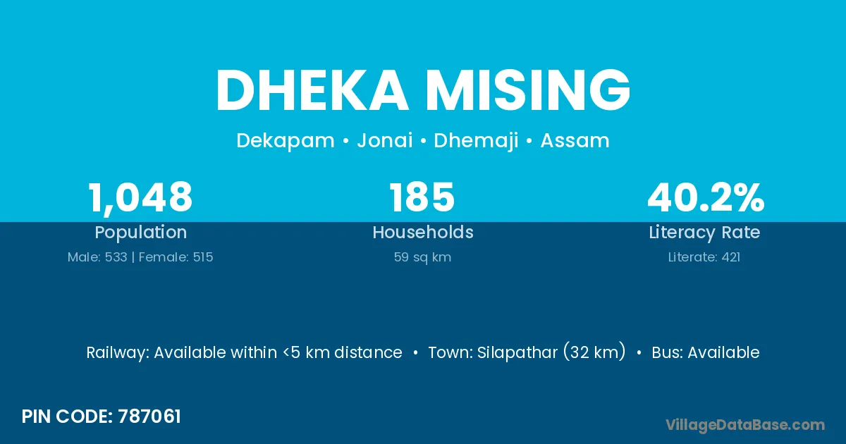 Dheka Mising village has a total population of 1,048 people, of which 533 are males and 515 are females.