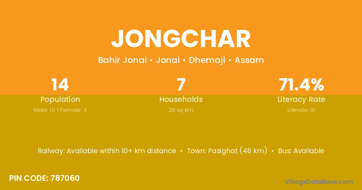The literacy rate of Jongchar village is 71.43%. Male literacy stands at 60.00% and female literacy at 100.00%.
