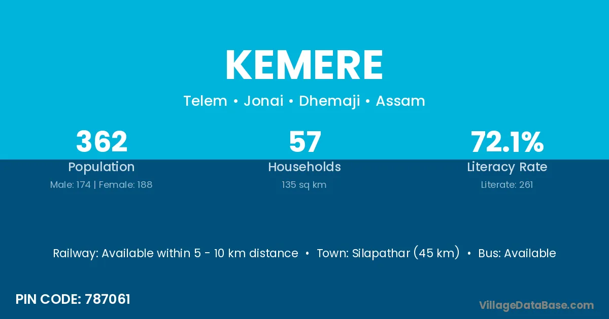 Silapathar (45 km) is the nearest town to Kemere village for major economic activities and is located approximately 45 km away.