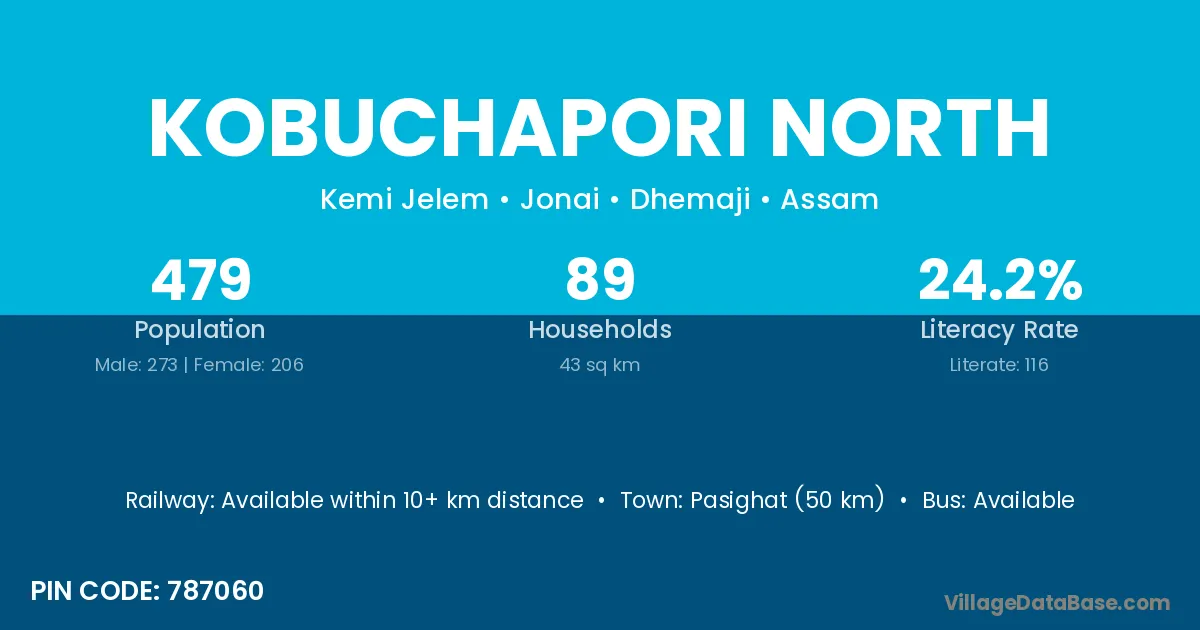 The literacy rate of Kobuchapori North village is 24.22%. Male literacy stands at 25.27% and female literacy at 22.82%.