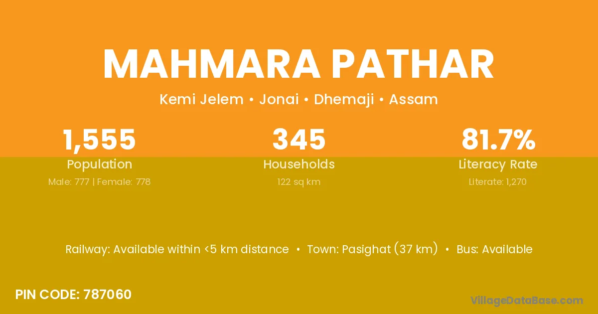 Pasighat (37 km) is the nearest town to Mahmara Pathar village for major economic activities and is located approximately 37 km away.