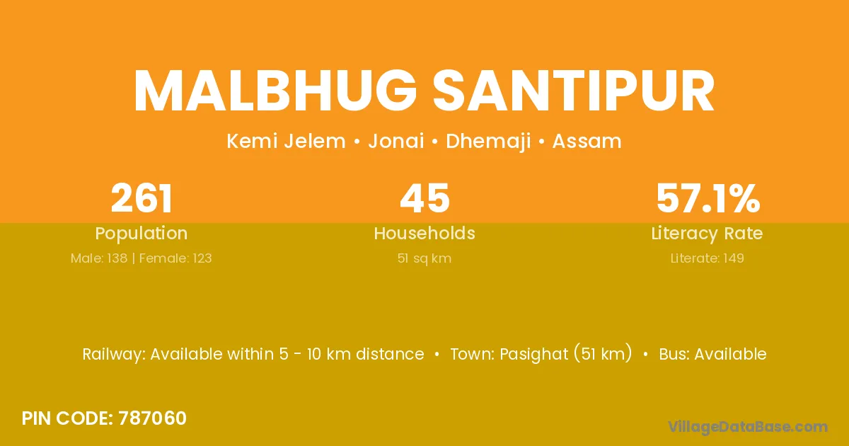 Pasighat (51 km) is the nearest town to Malbhug Santipur village for major economic activities and is located approximately 51 km away.