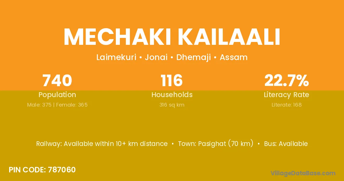 Pasighat (70 km) is the nearest town to Mechaki Kailaali village for major economic activities and is located approximately 70 km away.