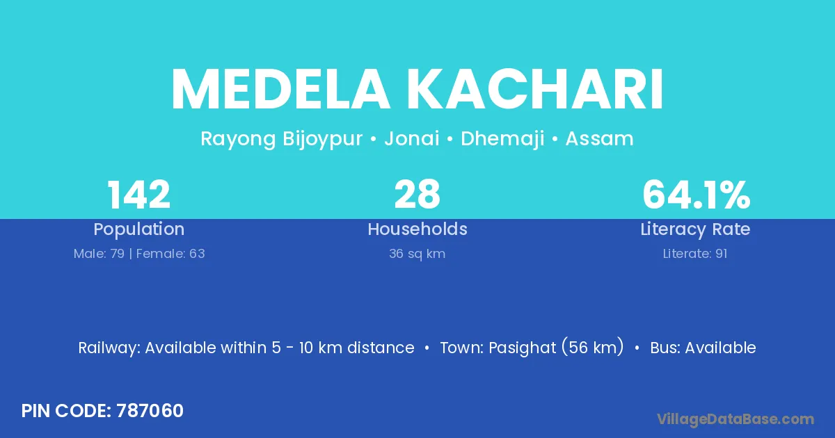 Pasighat (56 km) is the nearest town to Medela Kachari village for major economic activities and is located approximately 56 km away.