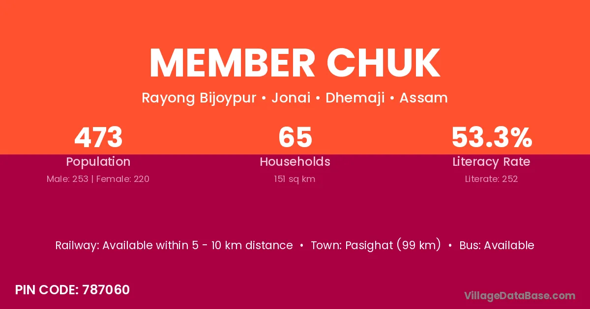 Pasighat (99 km) is the nearest town to Member Chuk village for major economic activities and is located approximately 99 km away.