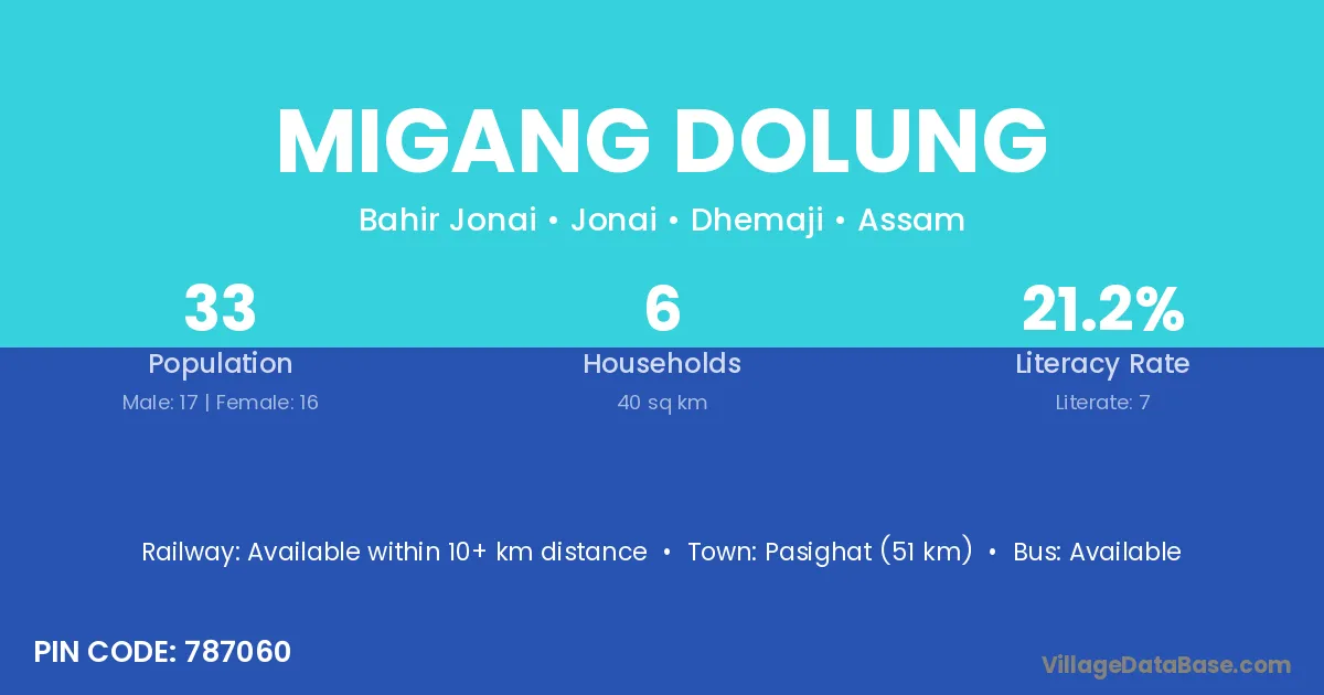 Migang Dolung village has a total population of 33 people, of which 17 are males and 16 are females.