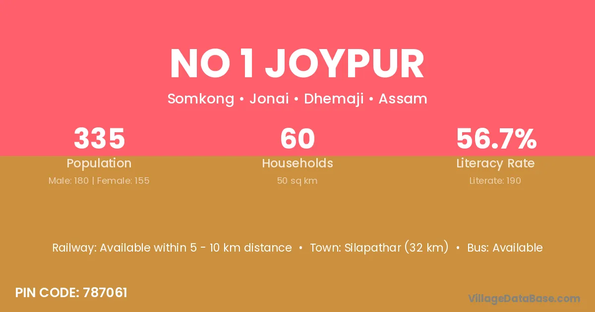 Silapathar (32 km) is the nearest town to No 1 Joypur village for major economic activities and is located approximately 32 km away.