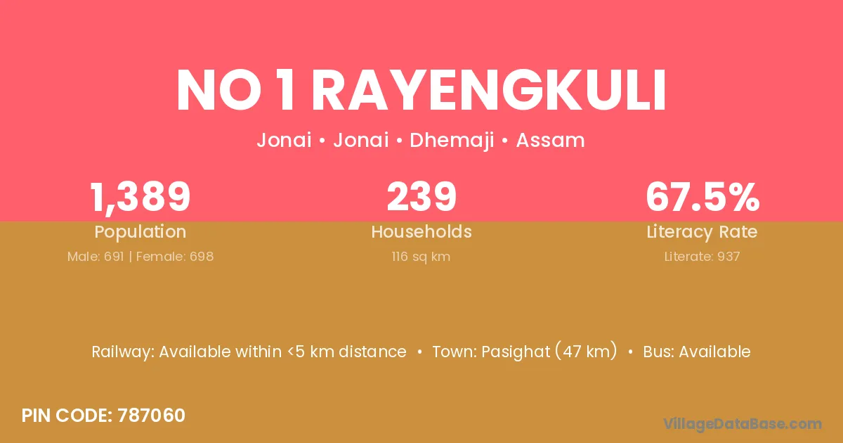 No 1 Rayengkuli village has a total population of 1,389 people, of which 691 are males and 698 are females.
