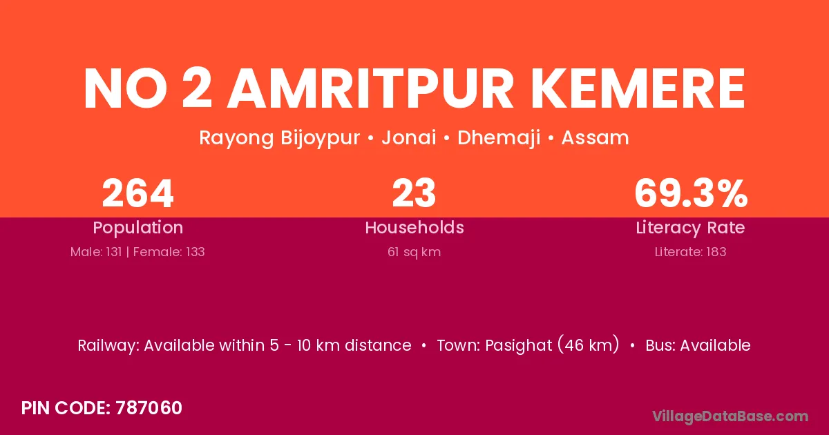 Pasighat (46 km) is the nearest town to No 2 Amritpur Kemere village for major economic activities and is located approximately 46 km away.