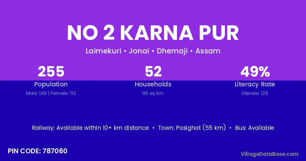 Pasighat (55 km) is the nearest town to No 2 Karna Pur village for major economic activities and is located approximately 55 km away.
