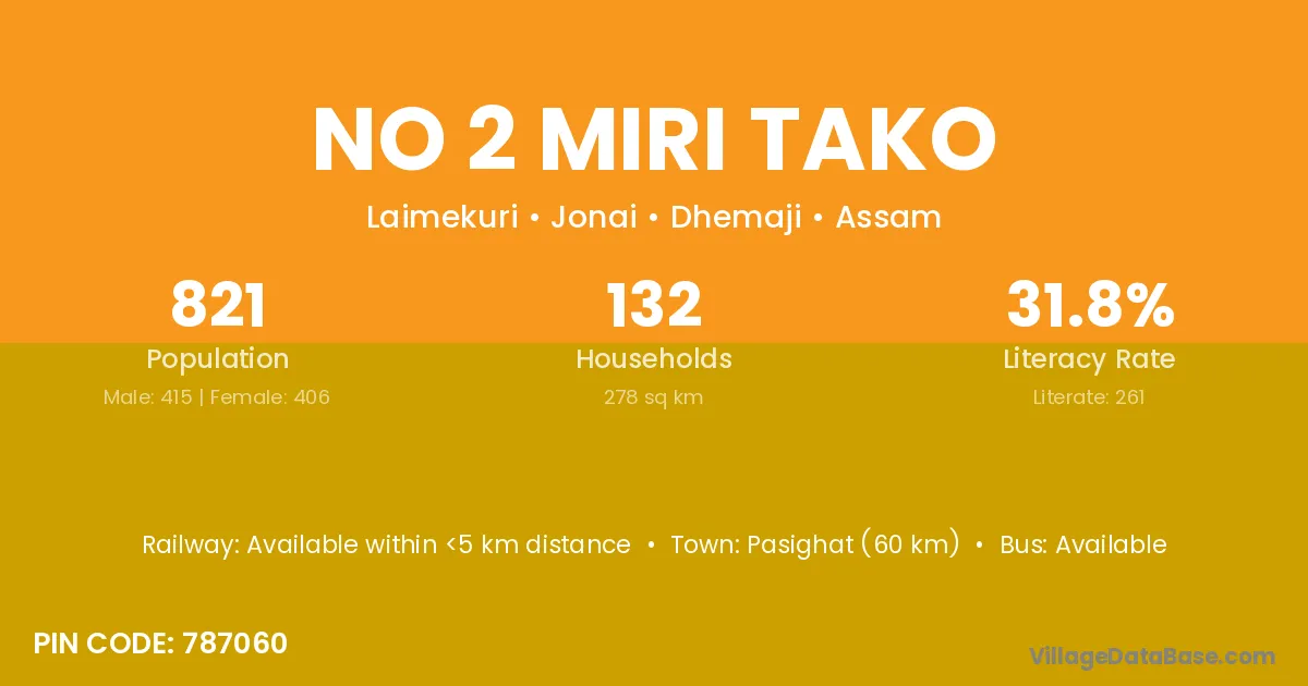 No 2 Miri Tako village has a total population of 821 people, of which 415 are males and 406 are females.