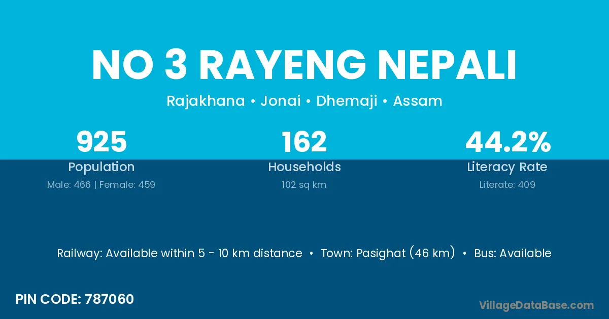 Pasighat (46 km) is the nearest town to No 3 Rayeng Nepali village for major economic activities and is located approximately 46 km away.
