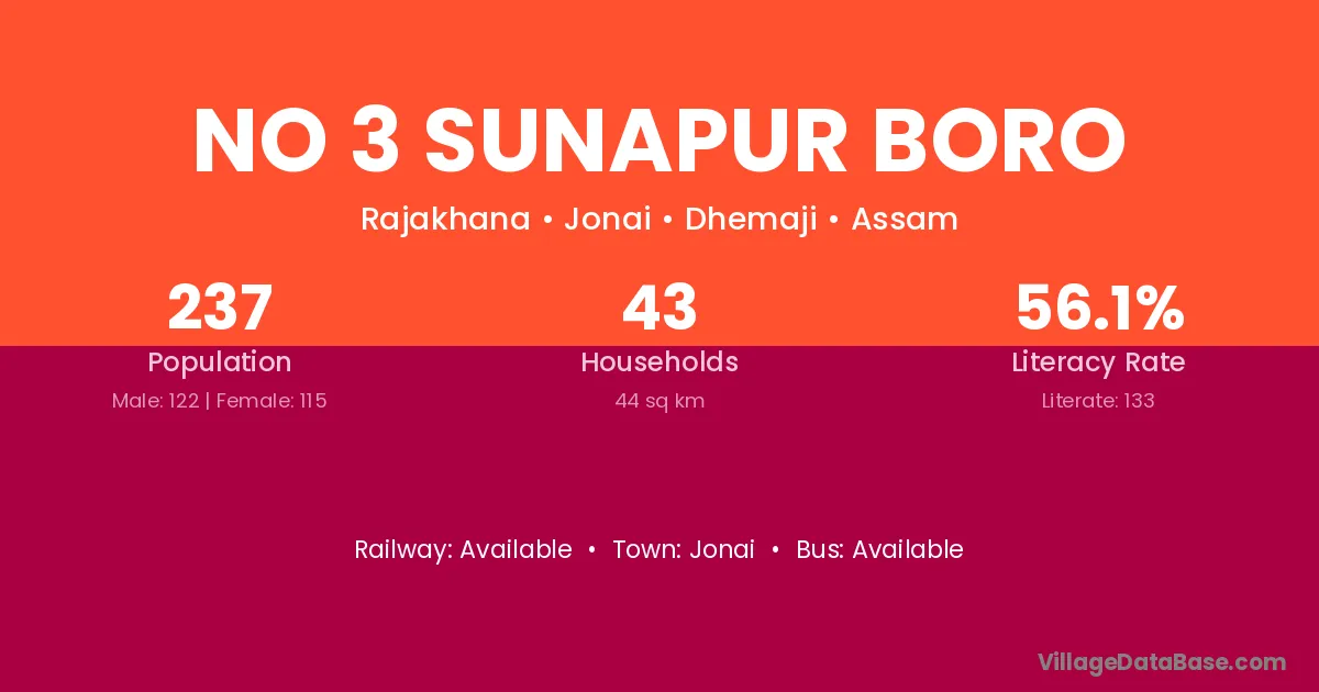 No 3 Sunapur Boro village has a total population of 237 people, of which 122 are males and 115 are females.