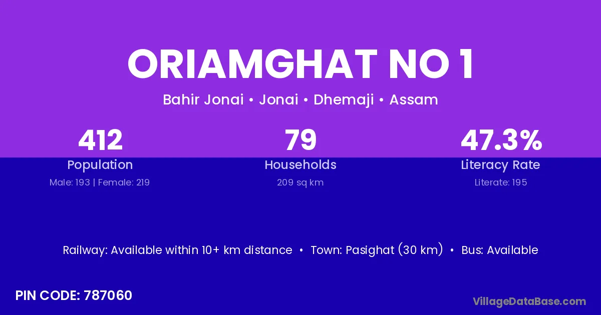 Oriamghat No 1 village has a total population of 412 people, of which 193 are males and 219 are females.