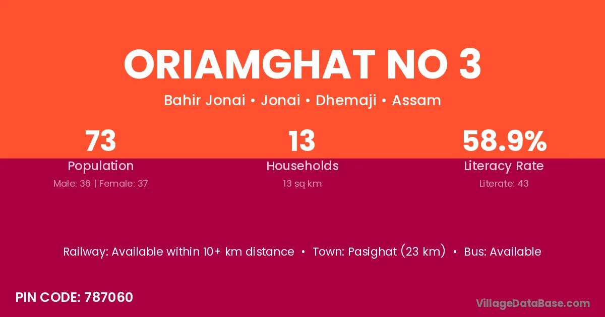 Oriamghat No 3 village has a total population of 73 people, of which 36 are males and 37 are females.