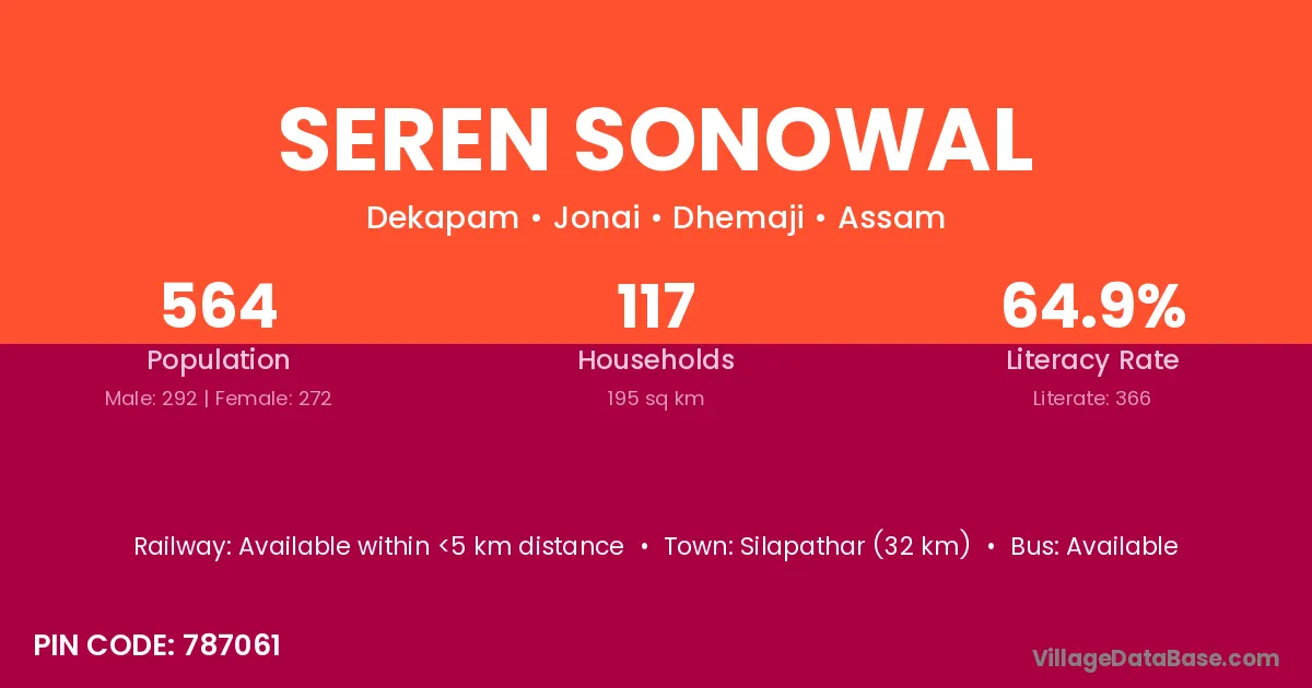 Silapathar (32 km) is the nearest town to Seren Sonowal village for major economic activities and is located approximately 32 km away.