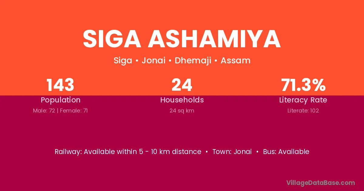 Siga Ashamiya village has a total population of 143 people, of which 72 are males and 71 are females.
