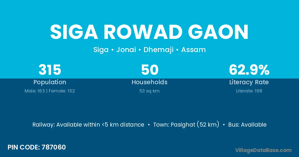 Siga Rowad Gaon village has a total population of 315 people, of which 163 are males and 152 are females.