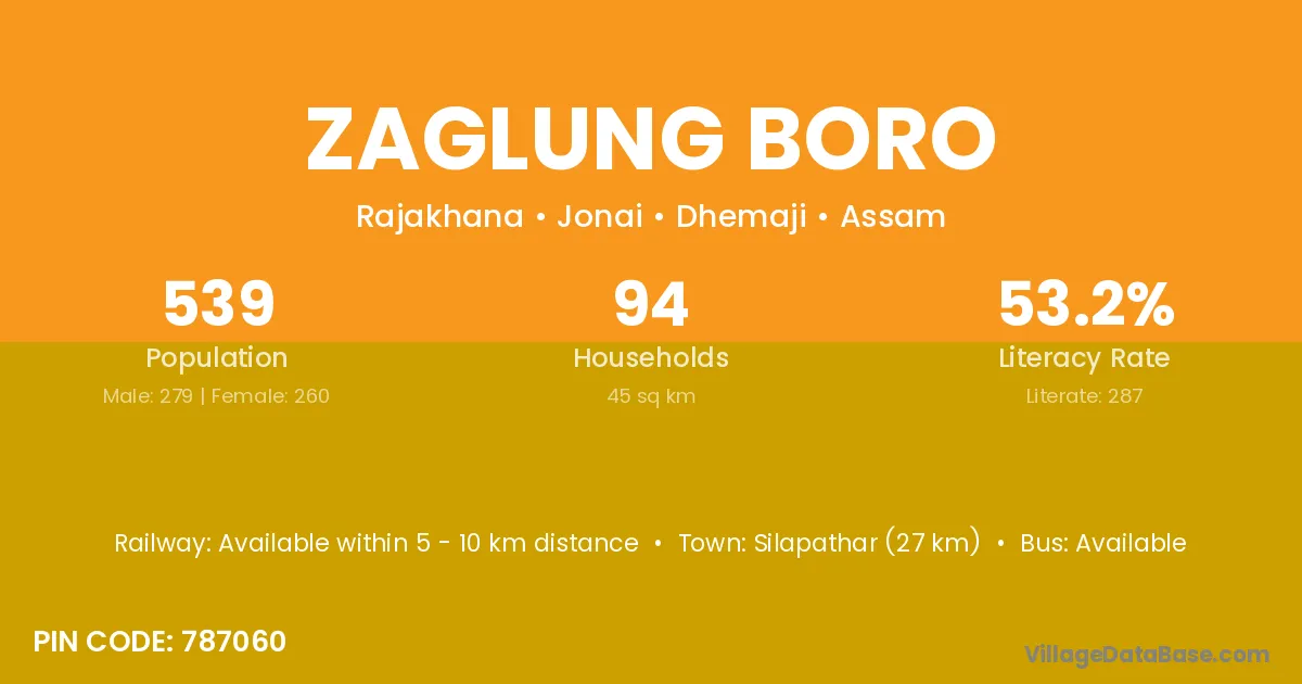 Silapathar (27 km) is the nearest town to Zaglung Boro village for major economic activities and is located approximately 27 km away.