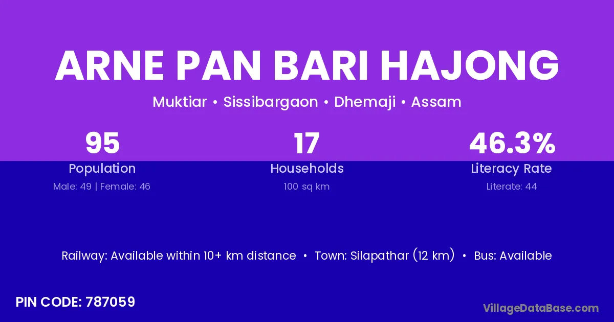 Silapathar (12 km) is the nearest town to Arne Pan Bari Hajong village for major economic activities and is located approximately 12 km away.