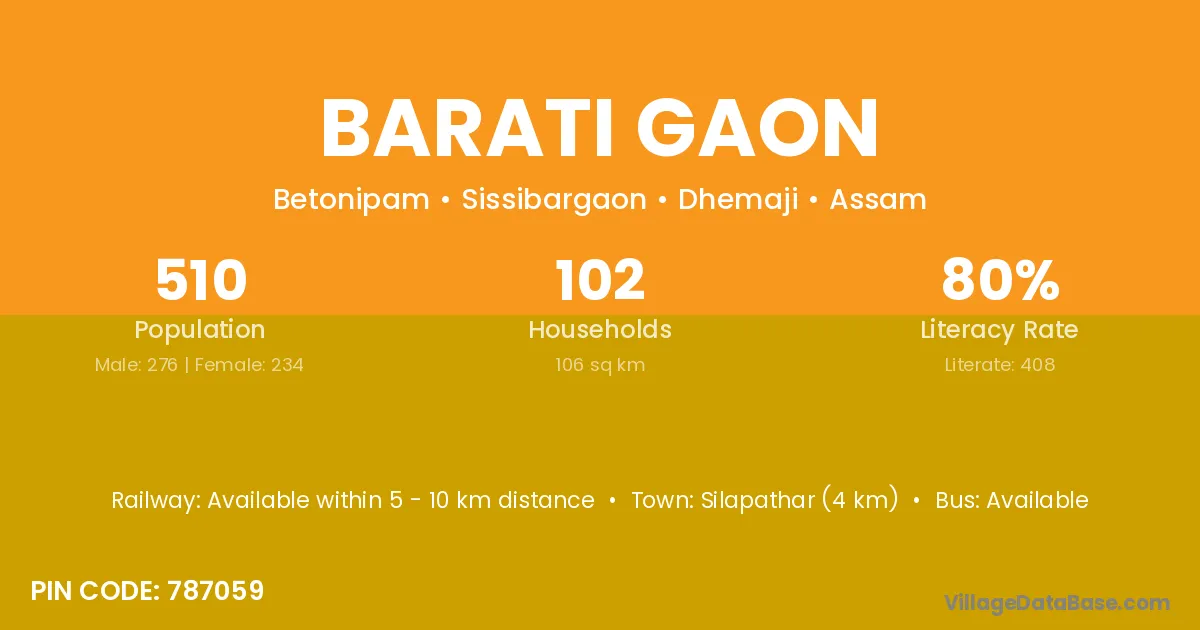 Silapathar (4 km) is the nearest town to Barati Gaon village for major economic activities and is located approximately 4 km away.