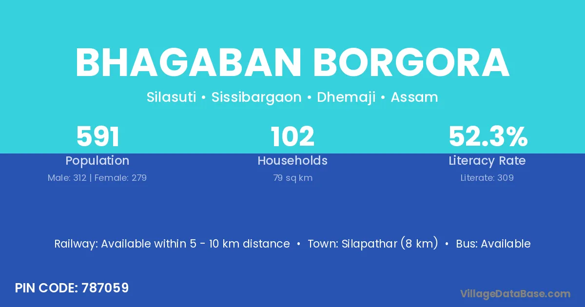 Silapathar (8 km) is the nearest town to Bhagaban Borgora village for major economic activities and is located approximately 8 km away.