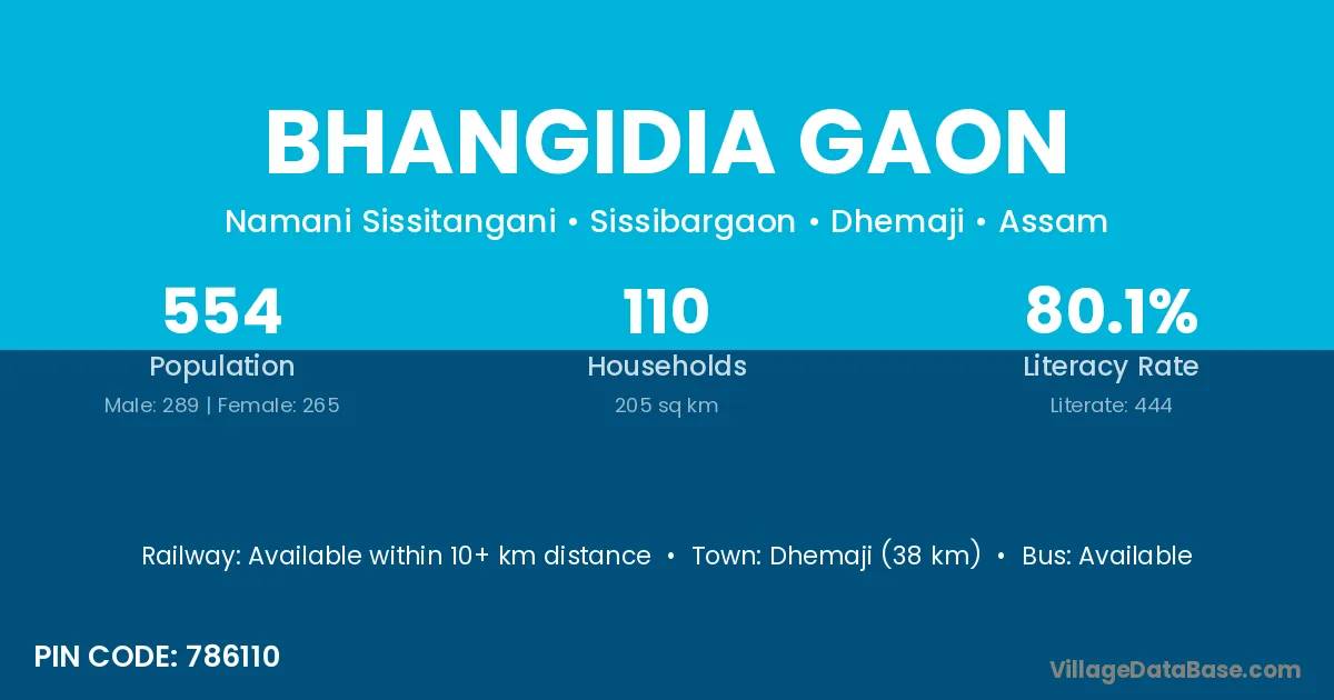 Bhangidia Gaon village has a total population of 554 people, of which 289 are males and 265 are females.
