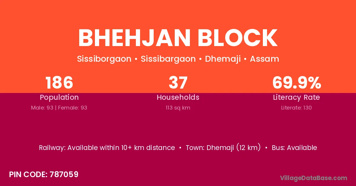 Dhemaji (12 km) is the nearest town to Bhehjan Block village for major economic activities and is located approximately 12 km away.