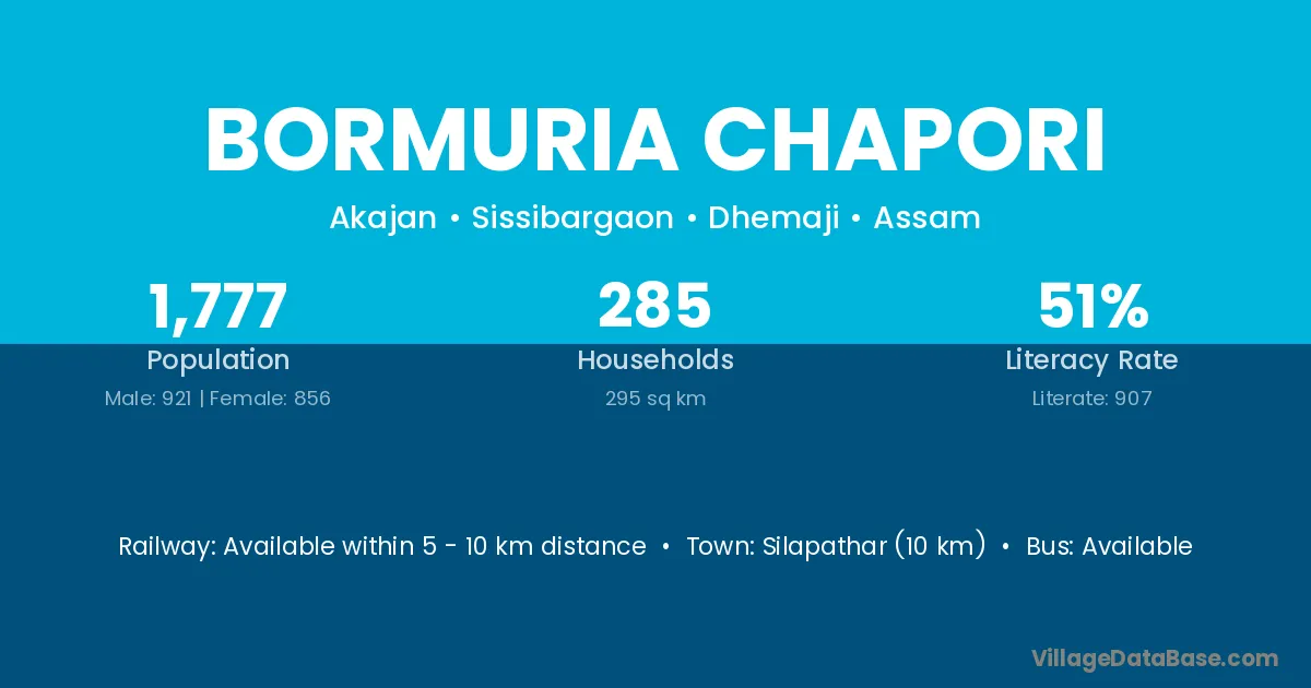 Silapathar (10 km) is the nearest town to Bormuria Chapori village for major economic activities and is located approximately 10 km away.
