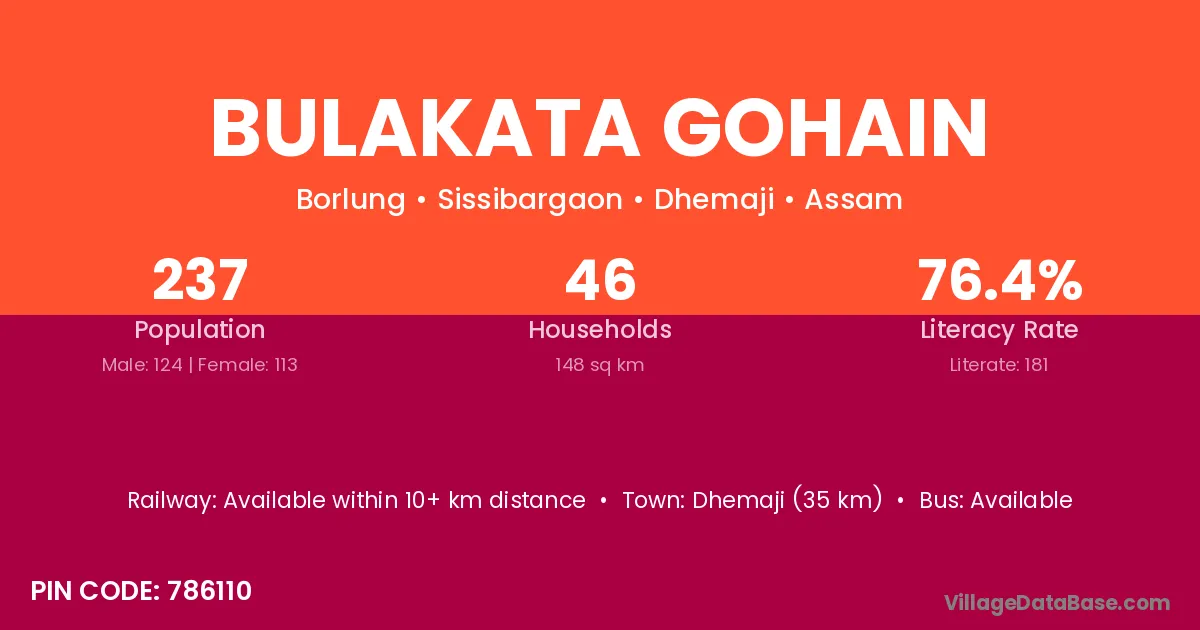 Bulakata Gohain village has a total population of 237 people, of which 124 are males and 113 are females.