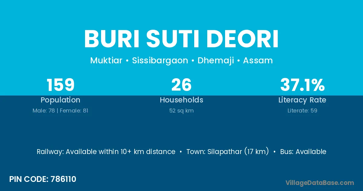 Silapathar (17 km) is the nearest town to Buri Suti Deori village for major economic activities and is located approximately 17 km away.
