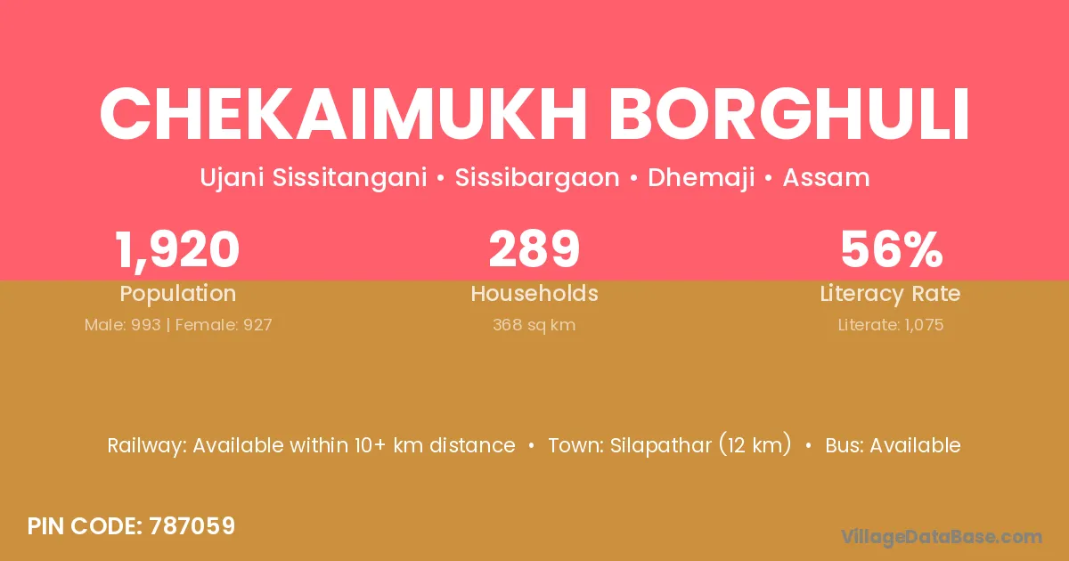Silapathar (12 km) is the nearest town to Chekaimukh Borghuli village for major economic activities and is located approximately 12 km away.