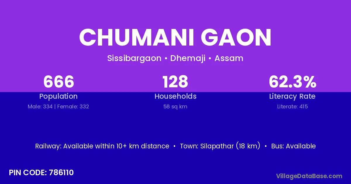 Silapathar (18 km) is the nearest town to Chumani Gaon village for major economic activities and is located approximately 18 km away.